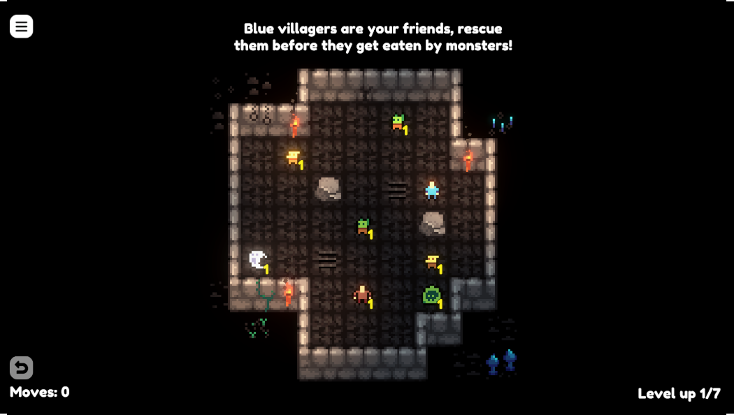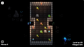 Enemies move together with you, each having a unique movement pattern. Some move in same direction as you, some move twice as fast, some only every second turn. Defeat an enemy by moving onto them, but be careful, as enemies can eat you, or your friends villagers, when you move!